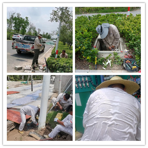 7月11日早上7点,主城区维修班组便已赶至市区迎宾大道,对该路段的路灯线路故障进行查找定位,进过一番查找终于在在潮湿阴暗的便民桥下找到2处故障点。中午11点,班组人员顾不上休息吃饭,加班加点的在桥下迂腐的烂泥中迅速开展土工作业,对故障线路进行恢复。闷热的桥下如同正在燃烧的锅炉房,热浪夹杂着腥臭的水气包裹在现场维修人员的身上,喝进去的的水赶不上流出的汗,工作服被汗水浸透,但班组的小伙子们早已习惯了这样的状态,手里的活一点没闲着,直到下午2点完成故障修复,路灯调试恢复亮灯。